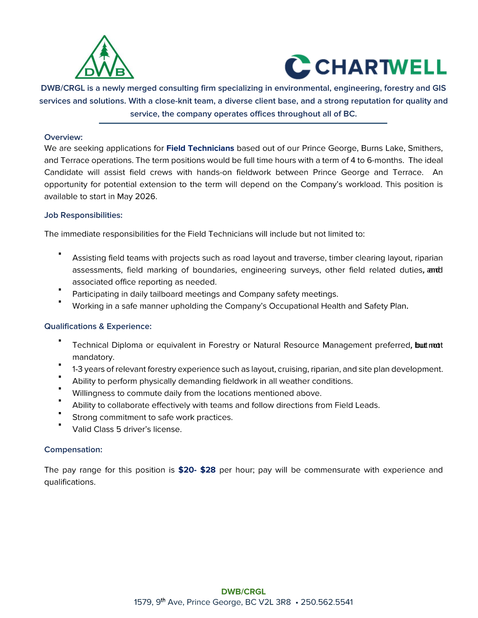 You can submit your resume and cover letter to: resumes@dwbconsulting.ca with “Field Technician” as the subject of the mail. Please include your preferred location (Prince George, Burns Lake, Smithers, or Terrace) in your cover letter. We wish to thank everyone for their interest in DWB/CRGL; however, only those selected for an interview will be contacted.