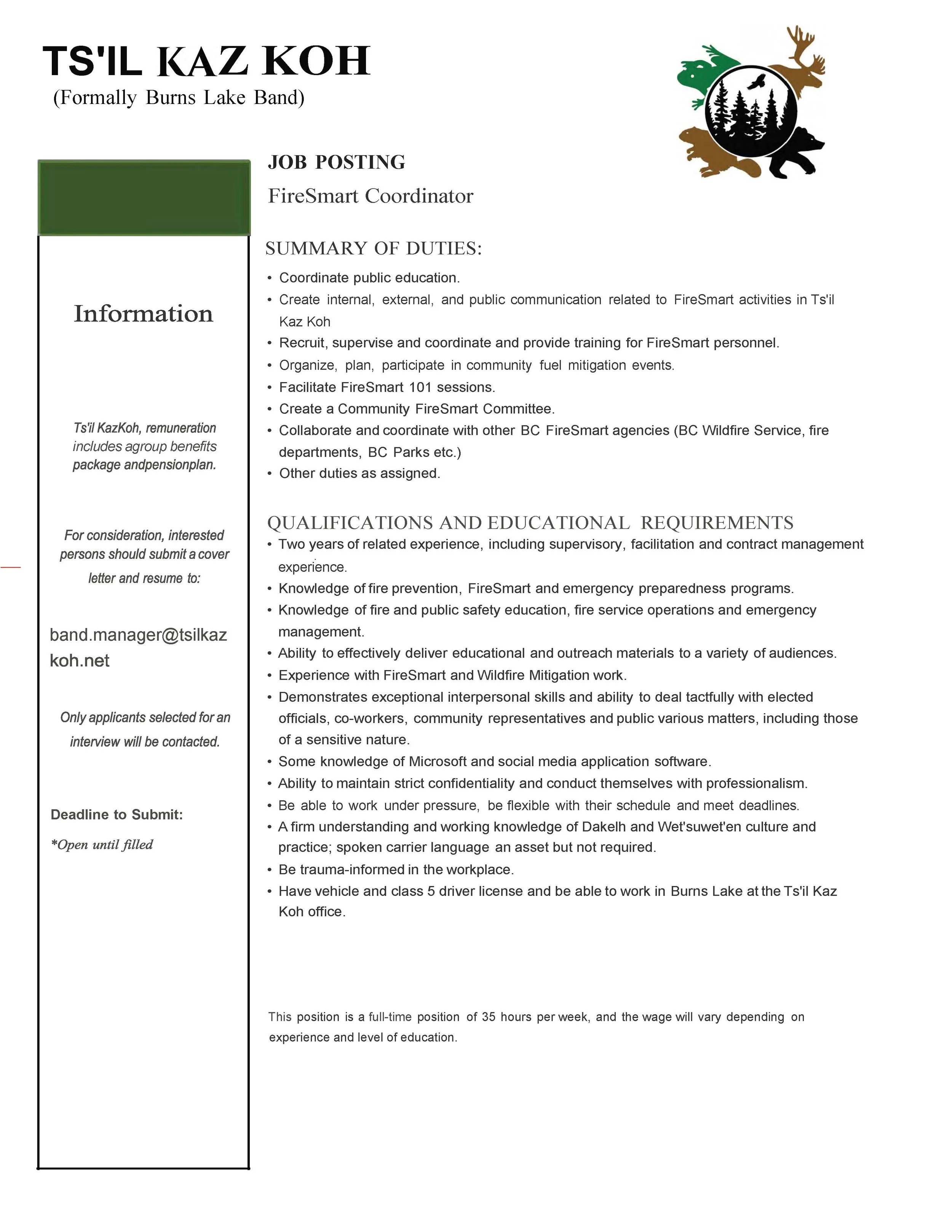 To apply, please email your resume and cover letter to band.manager@tsilkazkoh.net